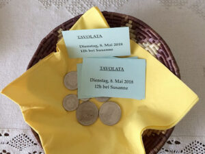 - Organisatorisches: Die Tavolata findet jeden Monat am zweiten Dienstag um 12 Uhr statt. Alle bezahlen für das Mittagessen mit Getränken und Kaffee 15 CHF. Die acht Teilnehmenden sind alleinstehende Senioren aus dem Quartier Grossacker. Es braucht keine Anmeldung. Wer nicht kommen kann, meldet sich ab.