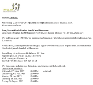 Anlässlich einer Informationsveranstaltung im Sommer 2018 entschieden Regula Signer, Zita Siegenthaler und Monika Hess, drei Frauen aus dem Dorf, eine intergenerative Tavolata zu gründen, und packten dieses Projekt tatkräftig und mit viel Resonanz an. Vier Mal hat diese Tavolata inzwischen stattgefunden, meist finden sich zwischen 20 und 25 Personen ein, die das gemeinsame Essen geniessen.